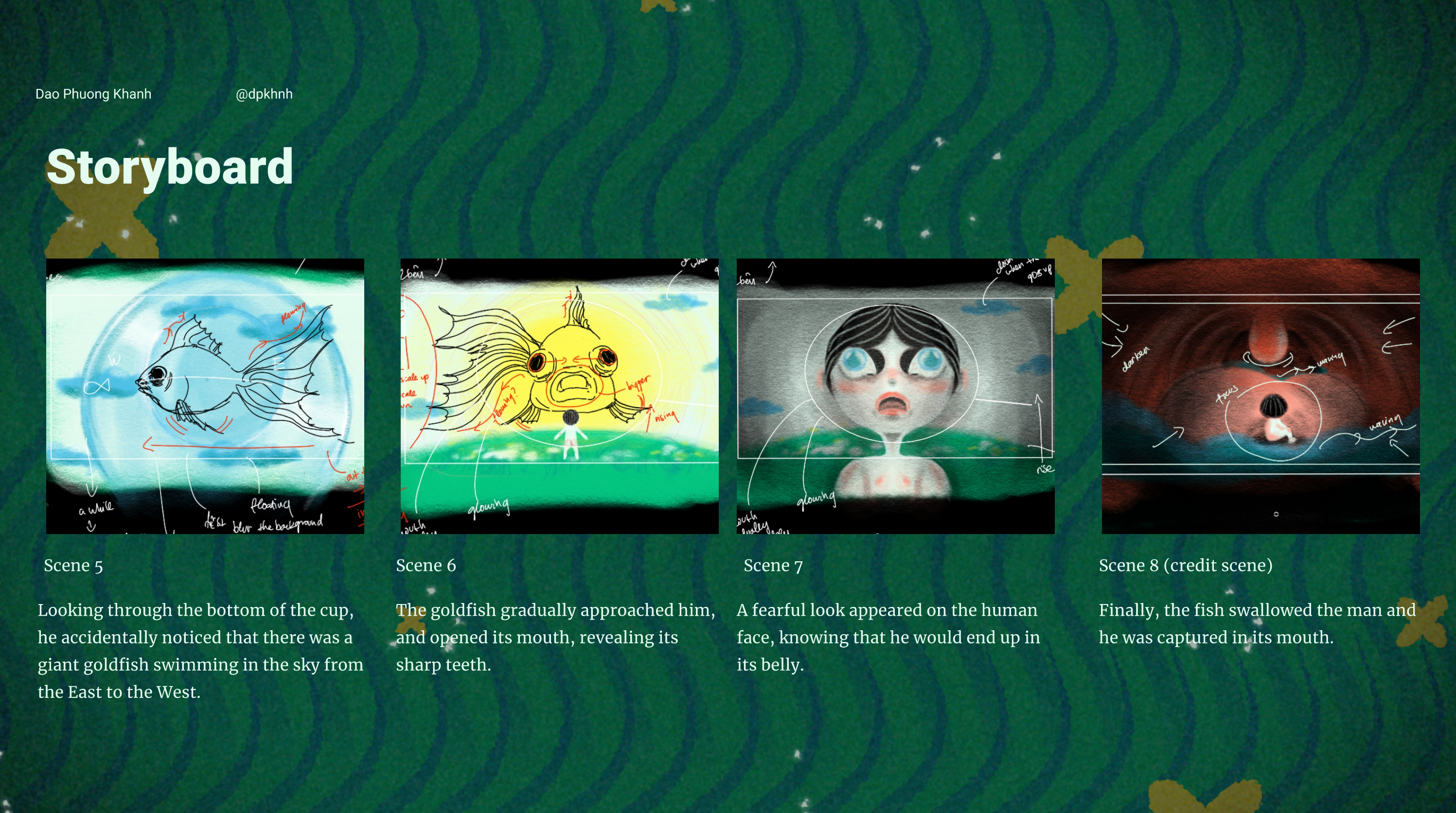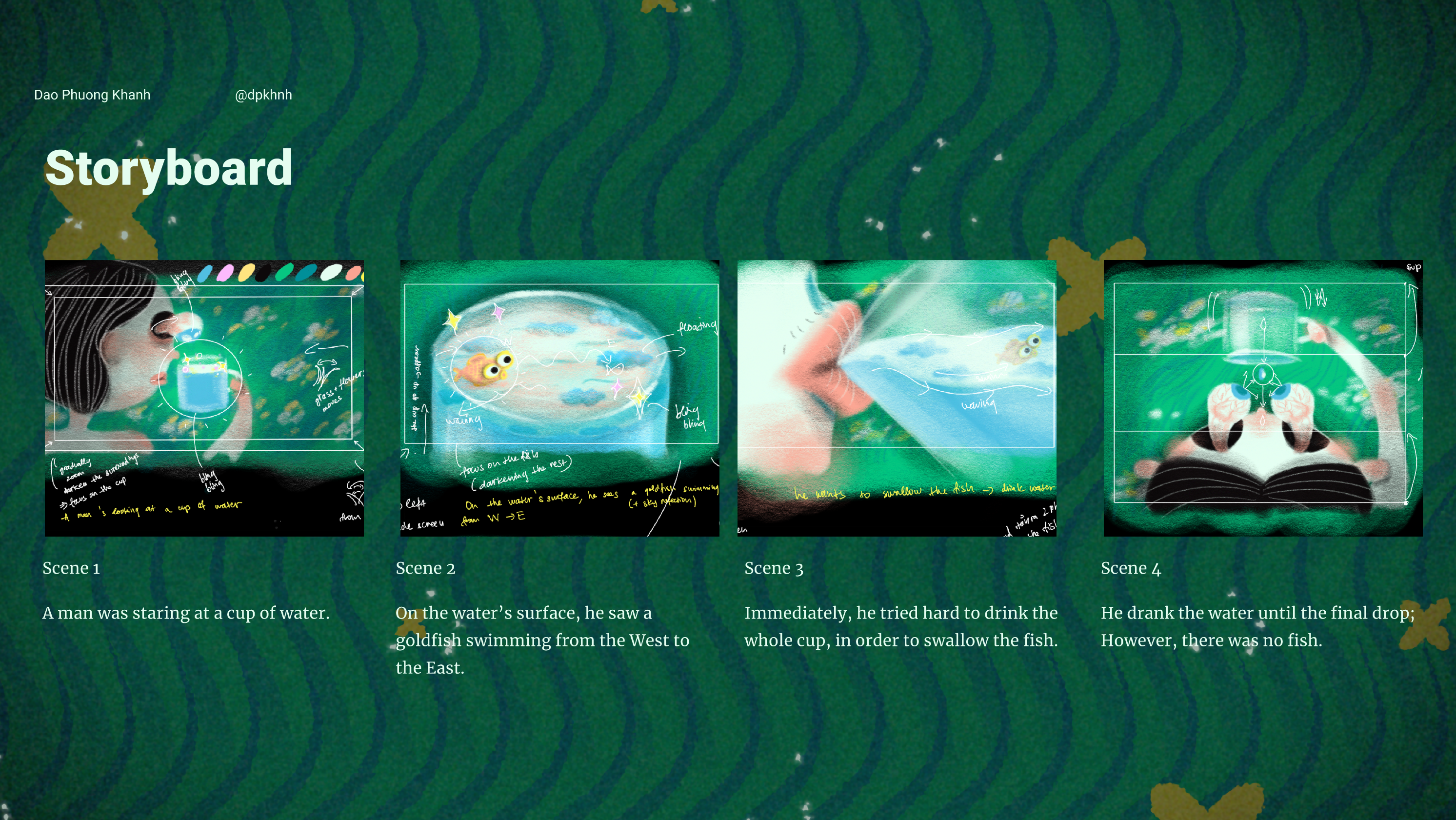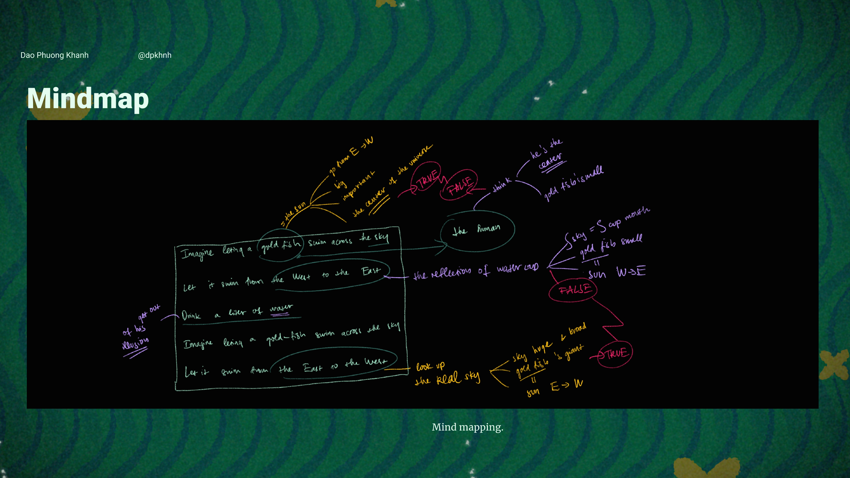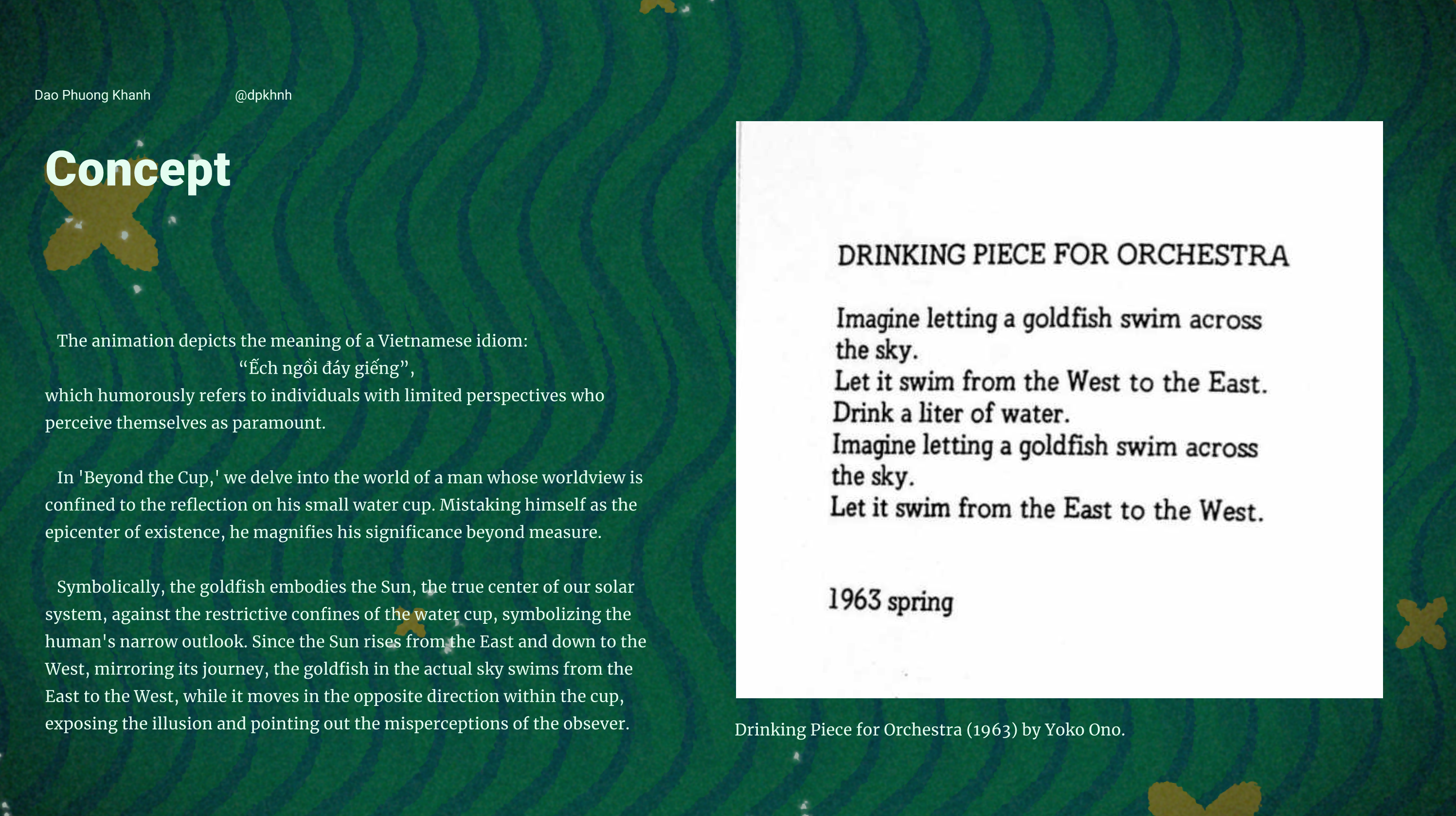 Symbolically, the goldfish embodies the Sun, the true center of our solar system, against the restrictive confines of the water cup, symbolizing the human's narrow outlook. Since the Sun rises from the East and down to the West, mirroring its journey, the goldfish in the actual sky swims from the East to the West, while it moves in the opposite direction within the cup, exposing the illusion and pointing out the misperceptions of the obsever.