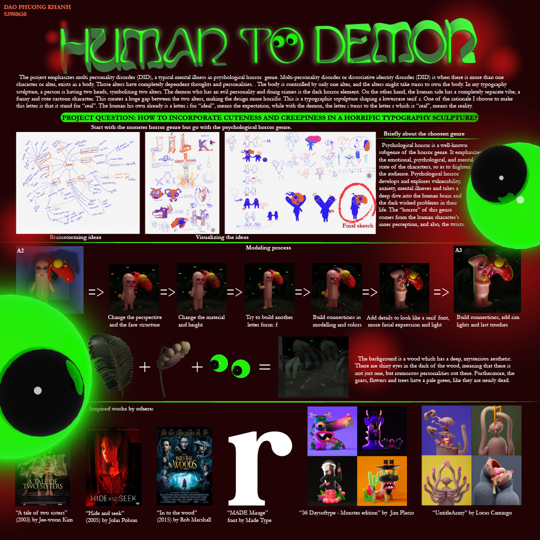 In my typography sculpture, a person has two heads, symbolizing two alters. The dark horror element is the demon with an evil personality and doing crimes. On the other hand, the human side has a completely separate vibe, a funny and cute cartoon character. This creates a huge gap between the two alters, making the design more horrific. This is a typographic sculpture shaping a lowercase serif r. One of the rationales I choose to make this letter is that it stands for “real”. The human his own already is a letter i for “ideal”, meaning the expectation, while with the demon, the letter i turns to the letter r which is “real”, and means reality.